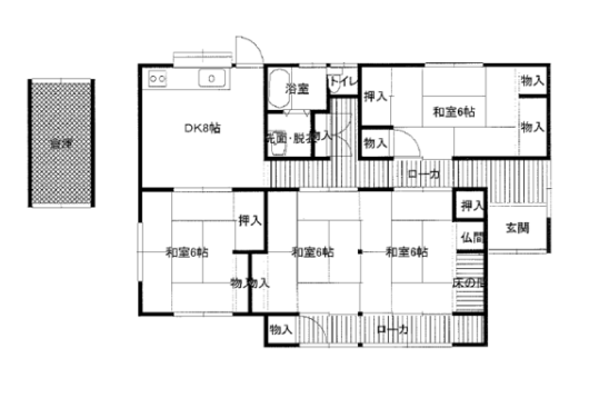 • 間取り内訳: 平屋建 4DK(和 6・6・6・6 DK 8)